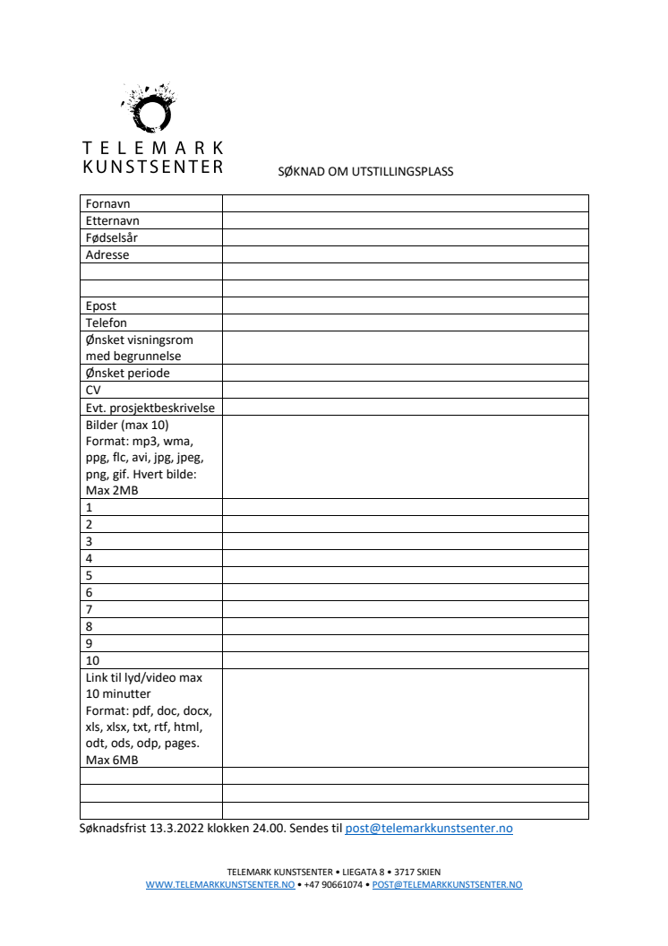 Søknader sendes til post@telemarkkunstsenter.no og vedlagte søknadskjema må fylles ut.