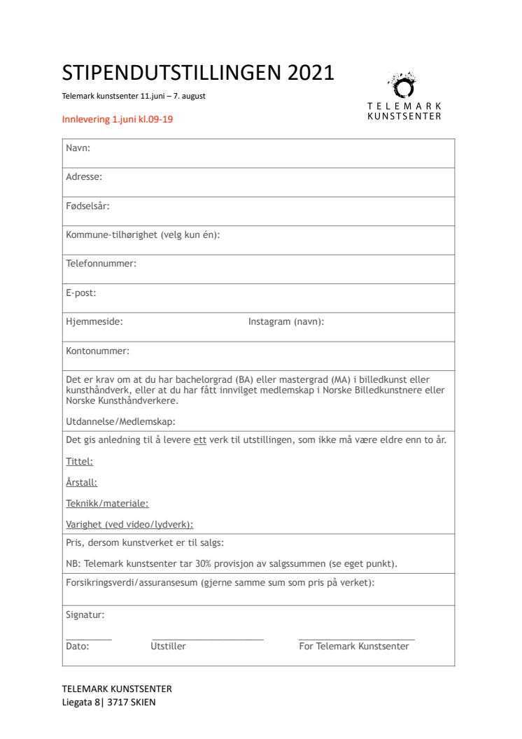 Innleveringsdato for verk er 1.juni på Telemark Kunstsenter, Liegata 8, Skien. Innlevering skjer mellom kl.09:00–19:00.