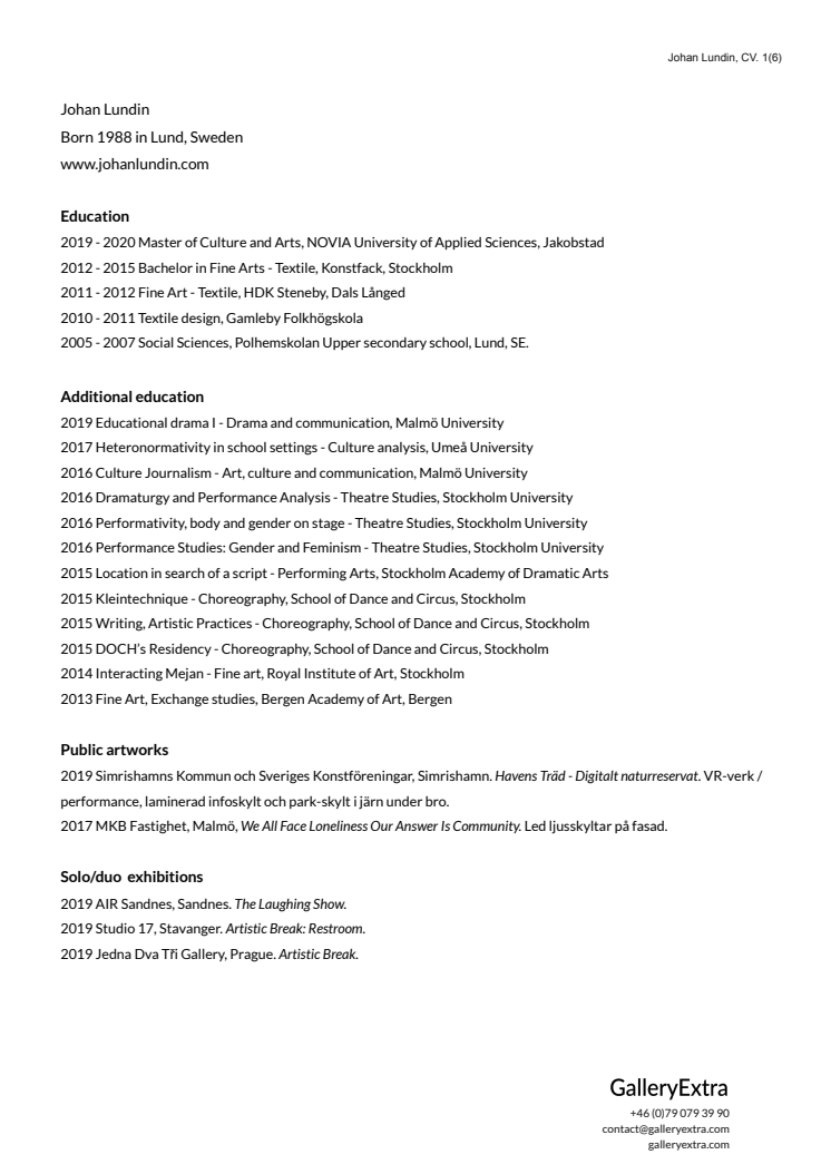 Johan Lundin er utdannet ved Konstfack Kunsthåndverkshøgskolen (SE), Steneby Skole for Design og Håndverk (SE), Kunst- og designhøgskolen i Bergen (NO) og Danse- og sirkusskolen (SE). Lundin bor og arbeider i Malmö.