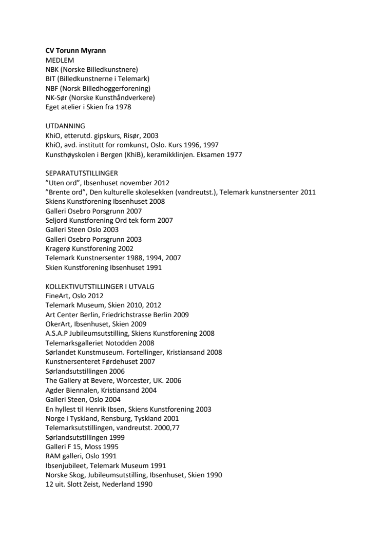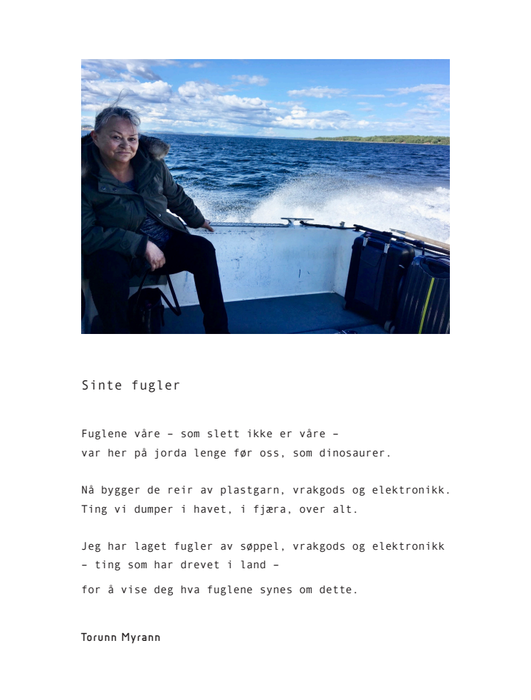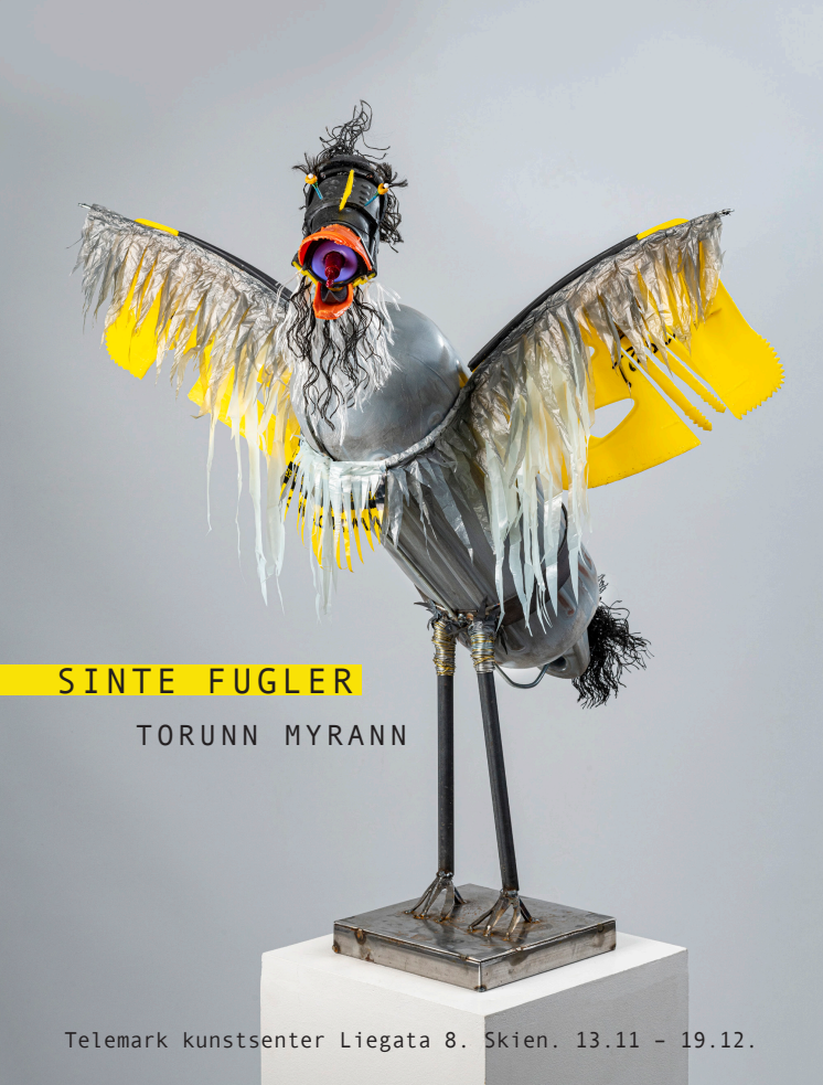 Torunn Myrann døde den 13. september i år, bare 67 år gammel. Hun hadde bak seg en lang rekke separat-, gruppe-, kollektivutstillinger og utsmykningsoppdrag. Ved en kraftanstrengelse maktet hun å ferdigstille utstillingens kunstverk før hun gikk bort. Sinte fugler vil derfor bli stående som Myranns siste budskap til oss.
