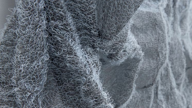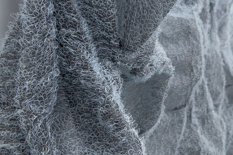 Ved hjelp av et lite håndholdt tufteverktøy har hun slått inn sting for sting. Tusenvis av små løkker som sammen skaper et poetisk og intenst fargespill for øyet. Verkene tillater likevel plass til mer enn det dystre, for i fargene og bruken av materialet går man fra transparent til solid, fra lett til tung - en visuell taktilitet som leker med blikket til beskueren når de beveger seg i verkets omkrets.