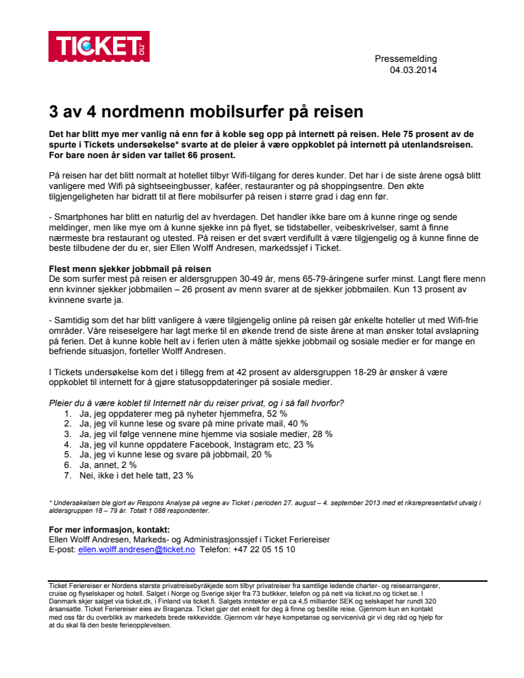 Det har blitt mye mer vanlig nå enn før å koble seg opp på internett på reisen. Hele 75 prosent av de spurte i Tickets undersøkelse svarte at de pleier å være oppkoblet på internett på utenlandsreisen.
