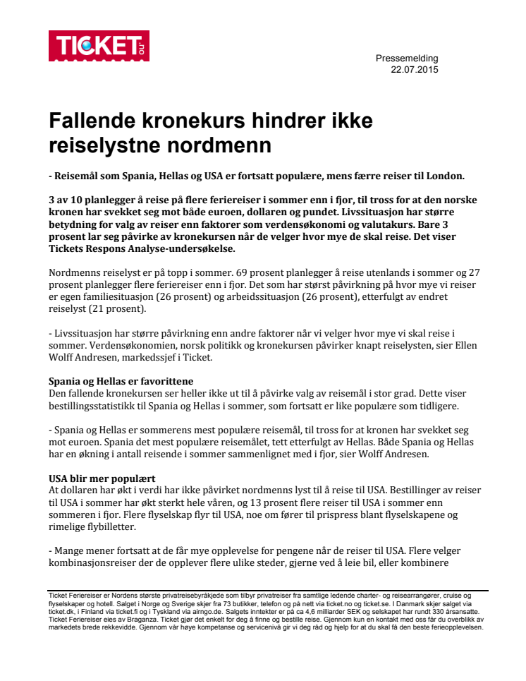 Reisemål som Spania, Hellas og USA er fortsatt populære, mens færre reiser til London. Undersøkelse viser at 3 av 10 planlegger å reise på flere feriereiser i sommer enn i fjor, til tross for at den norske kronen har svekket seg mot både euroen, dollaren og pundet. Livssituasjon har større betydning for valg av reiser enn faktorer valutakurs. Bare 3 prosent lar seg påvirke av kronekursen.