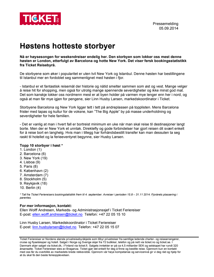 Nå er høysesongen for weekendreiser endelig her. Den storbyen som lokker oss mest denne høsten er London, etterfulgt av Barcelona og hotte New York. Det viser fersk bookingsstatistikk fra Ticket Reisebyrå.
