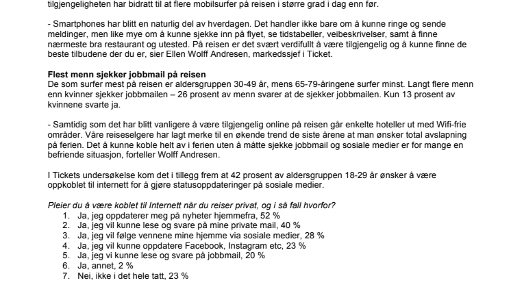 - Smartphones har blitt en naturlig del av hverdagen. Det handler ikke bare om å kunne ringe og sende meldinger, men like mye om å kunne sjekke inn på flyet, se tidstabeller, veibeskrivelser, samt å finne nærmeste bra restaurant og utested. På reisen er det svært verdifullt å være tilgjengelig og å kunne finne de beste tilbudene der du er, sier Ellen Wolff Andresen, markedssjef i Ticket.