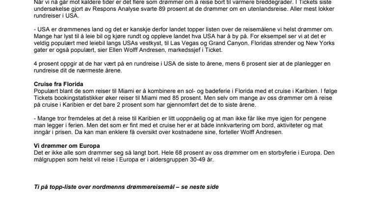 Når vi nå går mot kaldere tider er det flere som drømmer om å reise bort til varmere breddegrader. I Tickets siste undersøkelse gjort av Respons Analyse svarte 89 prosent at de drømmer om en utenlandsreise. Aller mest lokker rundreiser i USA.