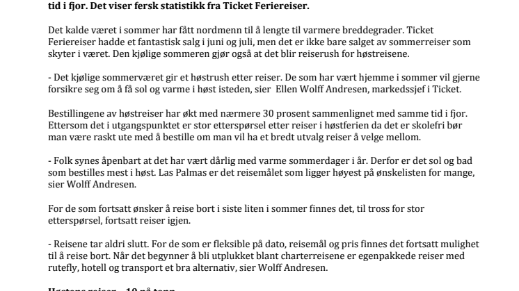 - Det kjølige sommerværet gir et høstrush etter reiser. De som har vært hjemme i sommer vil gjerne forsikre seg om å få sol og varme i høst isteden, sier Ellen Wolff Andresen, markedssjef i Ticket.