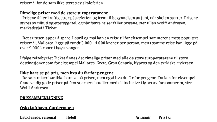 - Prisene faller kraftig etter påskeferien og frem til begynnelsen av juni, når skolen starter. Prisene styres av tilbud og etterspørsel, og når færre reiser faller prisene, sier Ellen Wolff Andresen, markedssjef i Ticket.