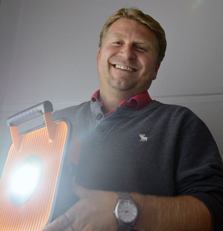 Produktsjef Espen Hanæs og Grunda lanserer nye kraftige arbeidslamper med bluetooth-tilkobling og USB-uttak.