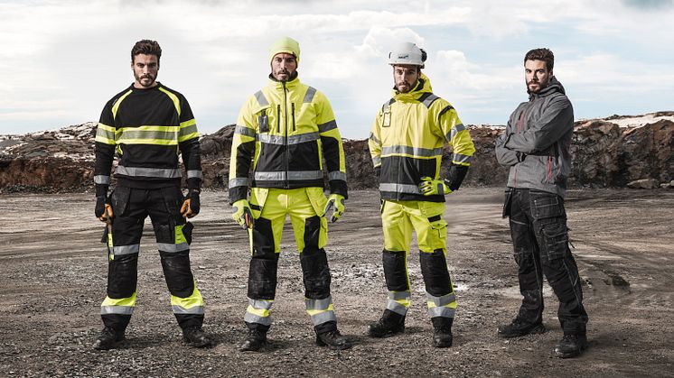 Fra venstre: Synlighetstøy i klasse 1, klasse 2 og klasse 3. Helt til høyre uten Hi-Vis.