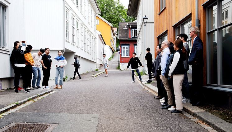 Fotograferingsseanse i Tønsbergs smågater. Representantene fra Koshipa, Dino Lab og Trainor fotograferes av studentene.