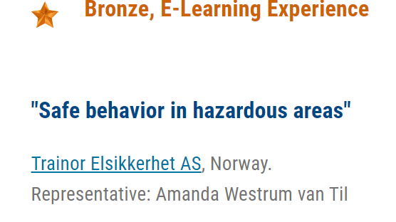 The International E-learning Award deles ut årlig av The International E-learning Association, og anerkjenner best bruk av teknologi for å forbedre læring og jobbytelse i bedrifter eller gjennom individuell faglig utvikling. At Trainor får pris nettopp for E-læringsopplevelse er resultat av flere års utrettelig arbeid for å heve kvalitet, læringsutbytte og læringslyst i en bransje der sikkerhet står i høysetet og riktig kompetanse er avgjørende. – Vår ambisjon er å sette en ny standard for sikkerhetsopplæring. Fordi gode fagfolk fortjener god opplæring. Og nå har vi altså fått en internasjonal anerkjennelse av at vår kursopplevelse er utrolig bra, avslutter en fornøyd Amanda.