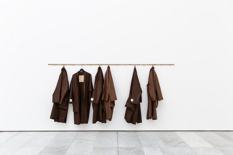 Hertling & Andreassen, 13 renselser. Brannmannskapets dusjknaggerekke. / Til Alf. Åtte Nattfrakker i brun bevernylon. Kolleksjon 1. Opplag 8/30. Foto: Christina Undrum Andersen.
