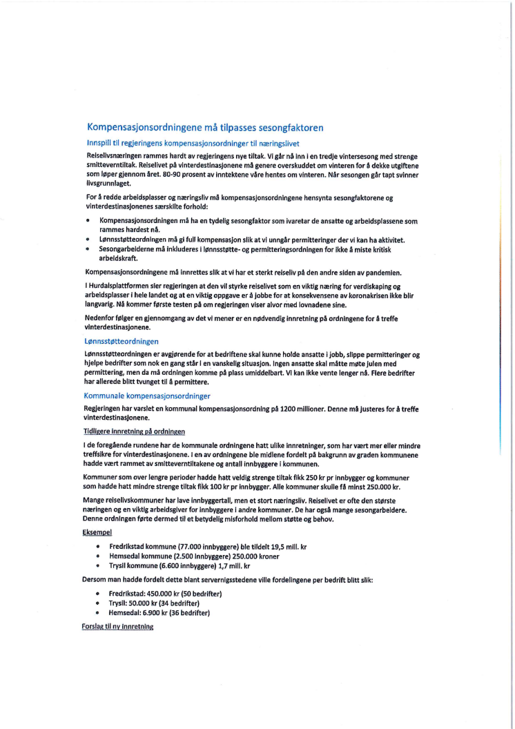 Innspill fra fjelldestinasjoner til regjeringens kompensasjonsordninger til næringslivet. Sendt til regjeringen og finanskomite torsdag 16. desember.