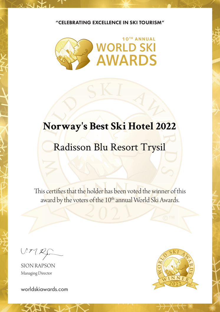 Radisson Blu Resort Trysil fikk i dag vite at de er tildelt den prestisjefylte prisen som «Norway Best Ski Hotel». Dette er en internasjonal pris som deles ut av World Ski Awards, hvor det er gjester selv som stemmer frem sine favoritter.