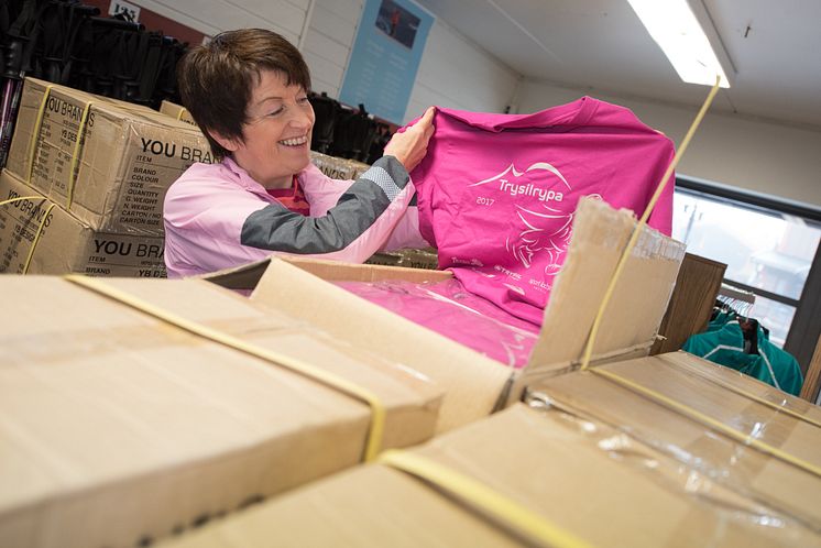 Arrangementsansvarlig Gedde Enberget er i gang med å pakke opp 600 rype t-skjorter.