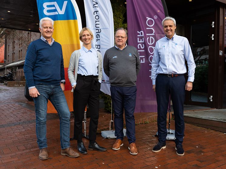 Samtlige av arrangørene var fornøyde med konferansedeltakelsen. Fra venstre: Tom Christian Egeland (daglig leder i Modena Fliser), Anne Smith (leder marketing i VB), Jarle Odland (daglig leder i Rexir Bygg) og Runar Soltveit (daglig leder i Balkongentreprenøren).