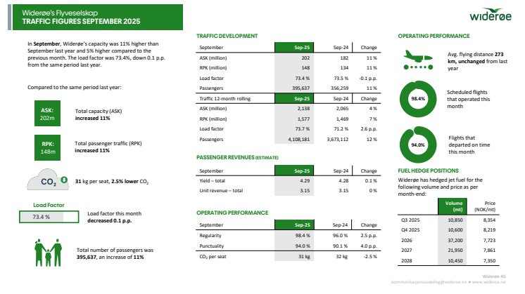 September ble en måned med solid vekst for Widerøe’s Flyveselskap. Produksjonen økte med 11 prosent sammenlignet med september i fjor. Totalt reiste 395.637 passasjerer med Widerøe i september, noe som tilsvarer en økning på 11 prosent mot samme periode i 2024. Samtidig som at flytilbudet økte, klarte selskapet å fylle flyene godt og i tråd med tilbudsveksten. Kabinfaktoren endte på 73,4 prosent i september.