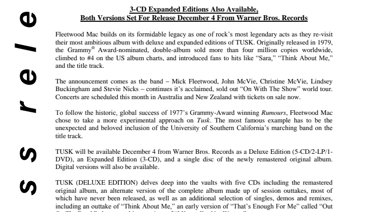 Fleetwood Mac er et av rockehistoriens største og mest legendariske band, og kommer nå med en deluxeutgave av deres fantastiske album Tusk fra 1979. På denne utgivelsen presenterer bandet en remastered versjon av det originale albumet, i tillegg til å ha børstet støv av en rekke andre versjoner. I tillegg følger det med en disc med 22 livetracks fra bandets Tusk-turné i 1979, en CD med single outtakes og demoer, samt en dobbel vinyl med 5.1 surround mix.