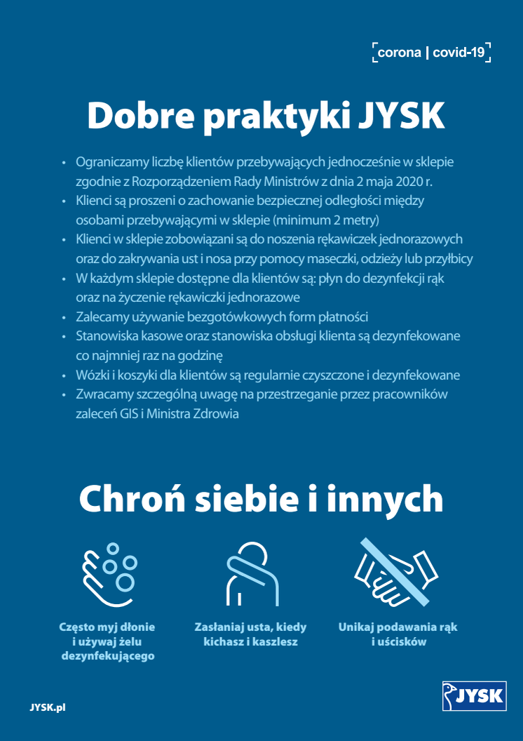 Wraz z wprowadzonym 4 maja drugim etapem łagodzenia obostrzeń w funkcjonowaniu gospodarki, JYSK wznawia sprzedaż we wszystkich sklepach stacjonarnych.