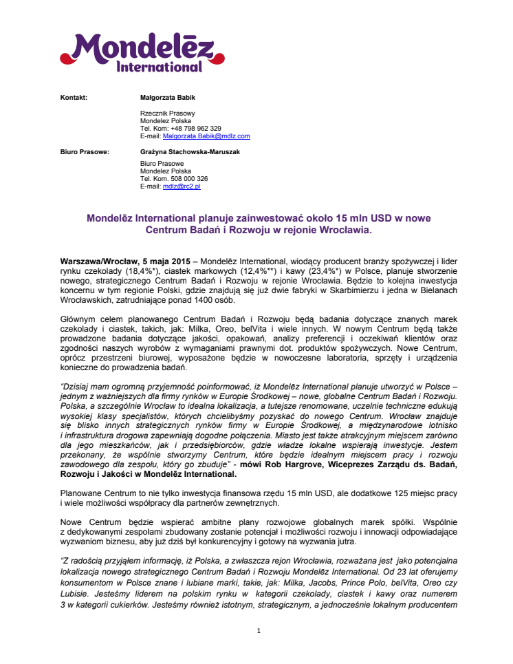 Mondelēz International, wiodący producent branży spożywczej i lider rynku czekolady (18,4%*), ciastek markowych (12,4%**) i kawy (23,4%*) w Polsce, planuje stworzenie nowego, strategicznego Centrum Badań i Rozwoju w rejonie Wrocławia. Będzie to kolejna inwestycja koncernu w tym regionie Polski.
