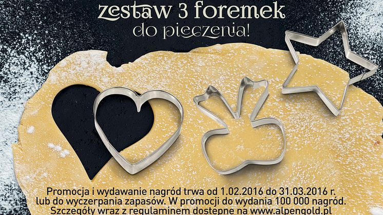 Wraz z kampanią, w punktach sprzedaży rusza akcja promocyjna, w której przy zakupie 3 czekolad Alpen Gold konsumenci otrzymają zestaw 3 foremek do ciasta w prezencie.