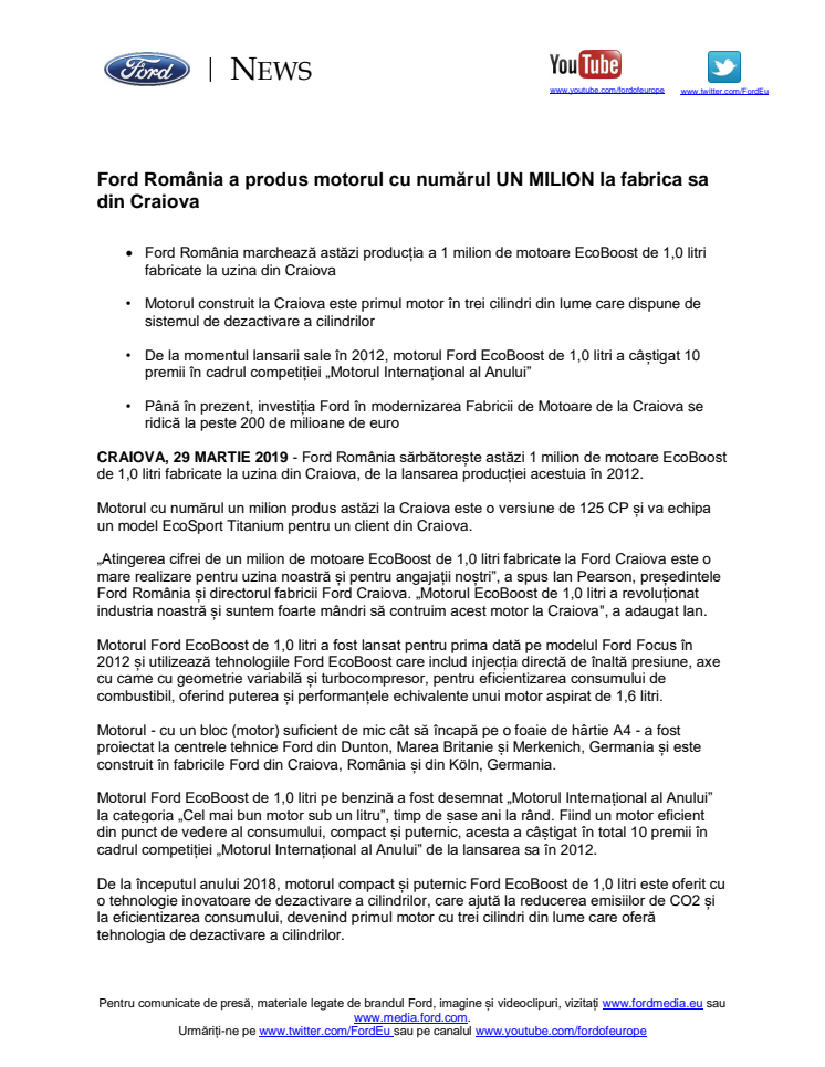 Ford România a produs motorul cu numărul UN MILION la fabrica sa din Craiova
