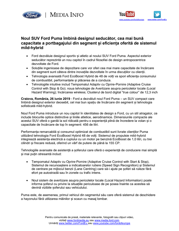 Noul SUV Ford Puma îmbină designul seducător, cea mai bună capacitate a portbagajului din segment și eficiența oferită de sistemul mild-hybrid