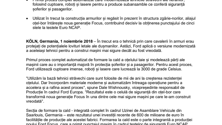 "Utilizăm la bază tehnici străvechi care sunt folosite de mii de ani la creșterea rezistenței oțelului. Dar încorporăm materiale moderne și automatizăm întreaga operațiune pentru a accelera și rafina acest proces", spune Dale Wishnousky, vicepreședinte responsabil de Producție în cadrul Ford Europa. "Rezultatul este o celulă de siguranță din oțel-bor care transformă noua generație Focus în una dintre cele mai sigure mașini pe care le-am construit vreodată".