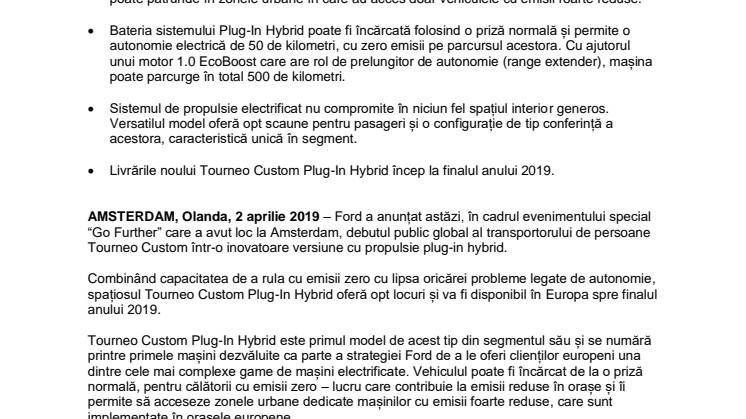 AMSTERDAM, Olanda, 2 aprilie 2019 – Ford a anunțat astăzi, în cadrul evenimentului special “Go Further” care a avut loc la Amsterdam, debutul public global al transportorului de persoane Tourneo Custom într-o inovatoare versiune cu propulsie plug-in hybrid.