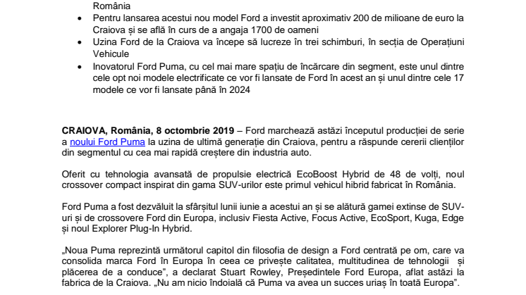 CRAIOVA, România, 8 octombrie 2019 – Ford marchează astăzi începutul producției de serie a noului Ford Puma la uzina de ultimă generație din Craiova, pentru a răspunde cererii clienților din segmentul cu cea mai rapidă creștere din industria auto.