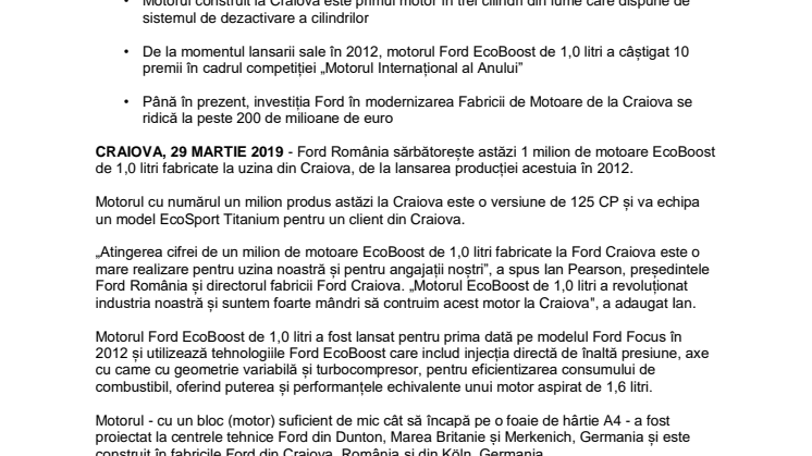 - Ford România marchează astăzi producția a 1 milion de motoare EcoBoost de 1,0 litri fabricate la uzina din Craiova