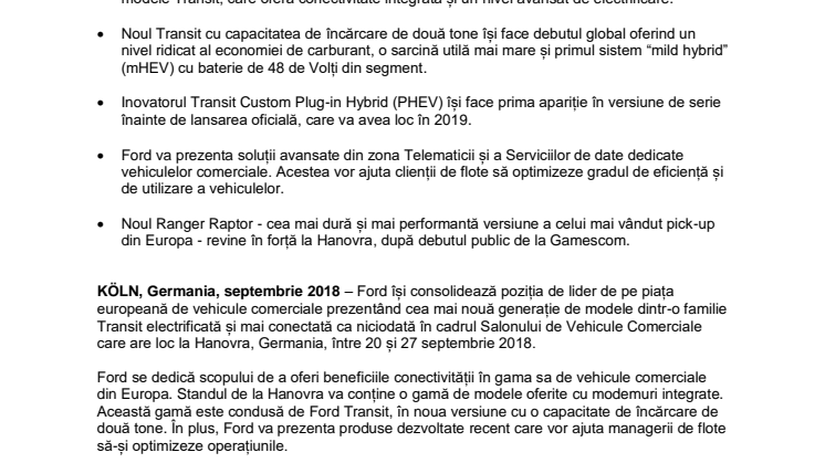 KÖLN, Germania, septembrie 2018 – Ford își consolidează poziția de lider de pe piața europeană de vehicule comerciale prezentând cea mai nouă generație de modele dintr-o familie Transit electrificată și mai conectată ca niciodată în cadrul Salonului de Vehicule Comerciale care are loc la Hanovra, Germania, între 20 și 27 septembrie 2018.