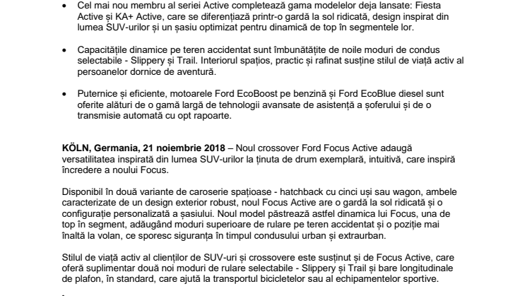 - Ford lansează noul Focus Active în variantele hatchback cu cinci uși și wagon. Modelul oferă un nivel superior de versatilitate și un design robust dedicat numărului tot mai mare de clienți europeni de SUV-uri și crossovere.