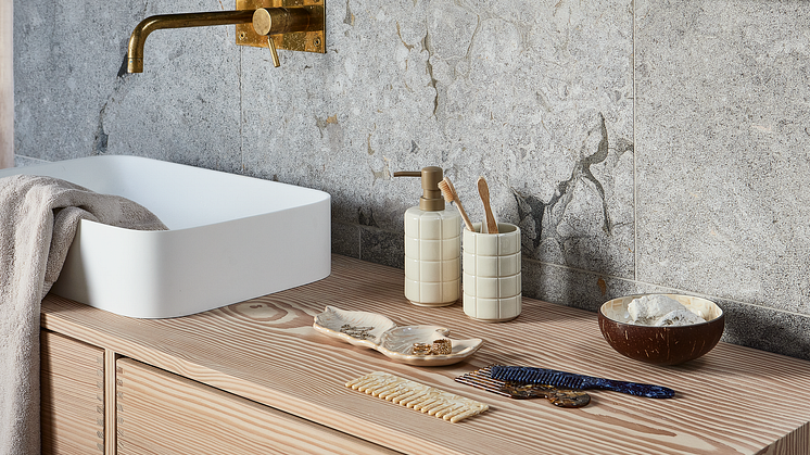 Un alt produs interesant din colecție este tava decorativă JESPER din ciment, un o formă unică, unghiulară, care poate fi folosită fie de sine stătător, fie ca suport pentru alte decorațiuni, precum sfeșnicul ARN din sticlă.