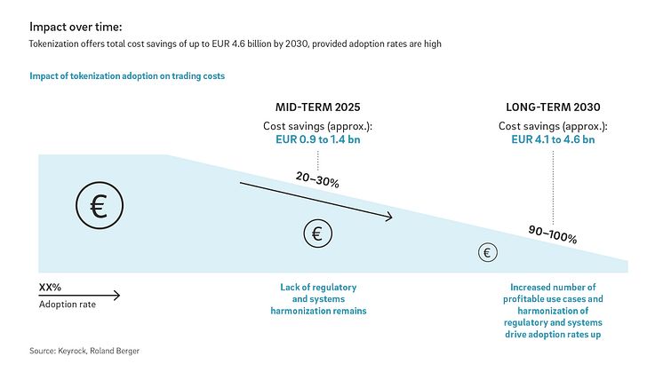 Munich, December 2021: Blockchain technology is revolutionizing the financial services industry. One of the most recent – and potentially most disruptive – of blockchain-based innovations is asset tokenization. While large-scale applications of this new technology are not in place yet, promising use cases exist across the globe already. In the long run, tokenization could lead to annual cost savings up to EUR 4.6 bn, from 2030 onwards. These are main findings in Roland Berger's study “The Tokenization of the Economy and its Impact on Capital Markets and Banks”, co-authored with Keyrock (a crypto market-maker based in Belgium).