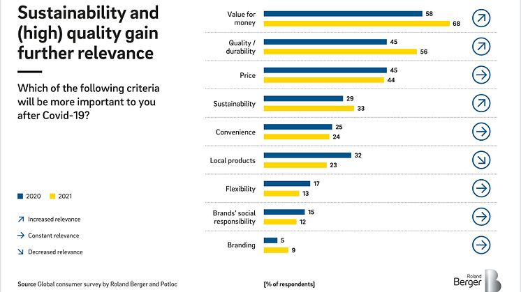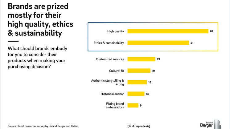 Munich, October 2021: The pandemic has irreversibly changed consumer behavior. Consumers are mainly prioritizing brands that offer sustainable products (51%) and high-quality standards (67%). Even though the trend toward online shopping is continuing unabated, smaller, physical stores can still benefit by offering exclusivity. Around one-third (32%) of consumers are frequenting such stores more often than they did before the crisis. These are the main findings from the study, “Decoding Consumer Behavior,” conducted by Roland Berger and Potloc, which questioned 2,100 consumers from twelve countries.