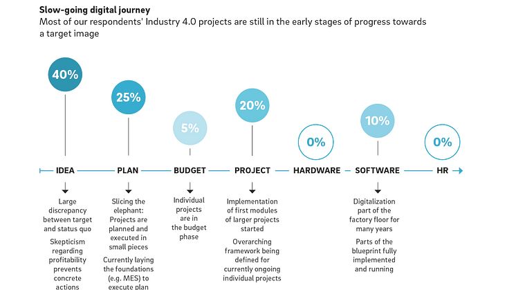 As the study shows, the majority of Industry 4.0 applications are still in the early stages of the implementation process: 40 percent of projects exist as an idea and 25 percent are in the planning stage. Above all, skepticism regarding profitability makes decision-makers shy away from concrete measures. Where new technologies are already being used, company representatives cite improving processes (64 percent) and reducing costs (44 percent) as the main drivers for digitalization, followed by increased quality (24 percent).