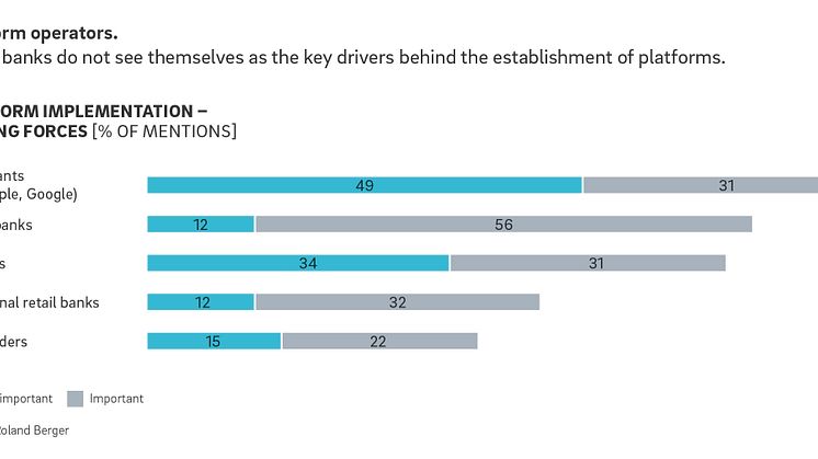 Time is running out, as evidenced by developments in other industries that have seen themselves turned upside down by the disruption of the platform economy. Just look at airlines, which often don't even sell their own flights anymore – tickets are frequently sold over platforms instead. A similar pace of development is already underway in the banking sector. Platforms already account for a significant share of the market for retail products, in particular, which make up more than 30 percent of the new business – a figure that is rising fast.