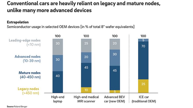 Munich, December 2021: The global semiconductor shortage is expected to last beyond 2022 for the automotive industry and many other sectors and will continue for several years. The biggest shortages are seen in older generation chips, the legacy semiconductors on which the automotive industry is reliant. But additional manufacturing capacities are mainly being built up in newer generations, meaning that these investments will offer little relief. These are among the key findings of the study "Steering through the semiconductor crisis. A sustained structural disruption requires strategic responses by the automotive industry" by Roland Berger.