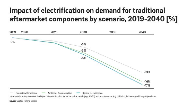 For each of these components, the study estimates the impact, both negative and positive, on "gross" demand on the aftermarket (excluding additional demand for new components and services, such as labour in workshops or software updates). In order to show the impact of electrification clearly, the study specifically excludes other macro factors such as the impact of the expected overall growth of the vehicle parc or inflation, and technical trends such as Advanced Driver Assistance Systems. In the Radical Electrification scenario, a drop of 12% by 2035 and 17% by 2040 is forecasted. The product categories most affected are the internal combustion engine and the drivetrain, where demand will fall by 49 and 51%, respectively. In the Regulatory Compliance scenario, the impact is expected to be reduced to -13% by 2040.