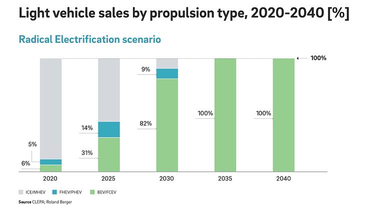 In the least progressive scenario ("Regulatory Compliance"), progress towards BEV-only is moderated by various headwinds, including rising battery raw material costs. The share of electric cars in total vehicle sales rises to 53% in 2030 and 96% in 2035, before reaching 99% in 2040.