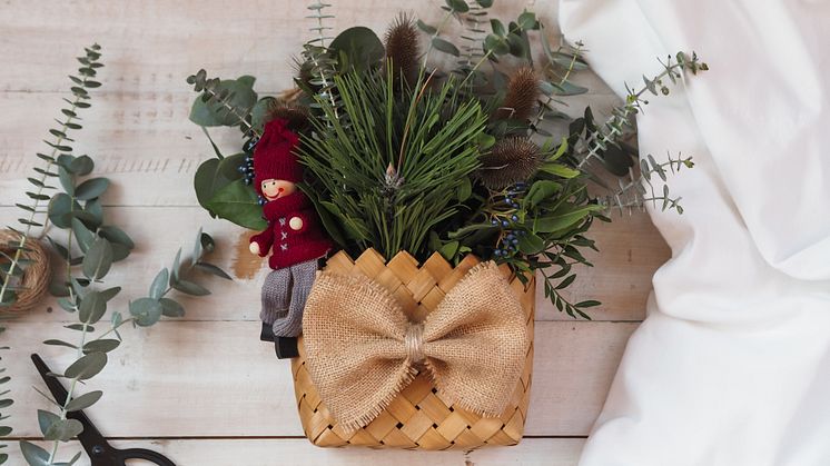 1. Zelenilo povezati kanapom ili žicom u buket koji odgovara veličini korpe
