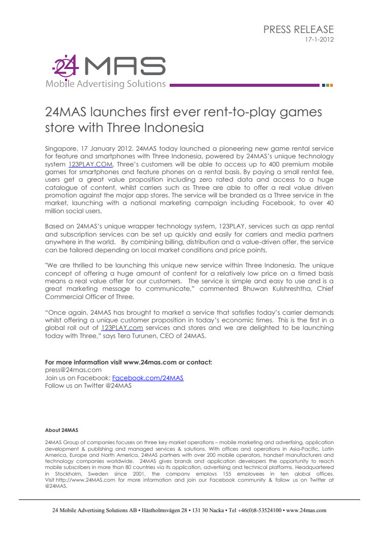 24MAS today launched a pioneering new game rental service for feature and smartphones with Three Indonesia, powered by 24MAS’s unique technology system 123PLAY.COM. Three’s customers will be able to access up to 400 premium mobile games for smartphones and feature phones on a rental basis.