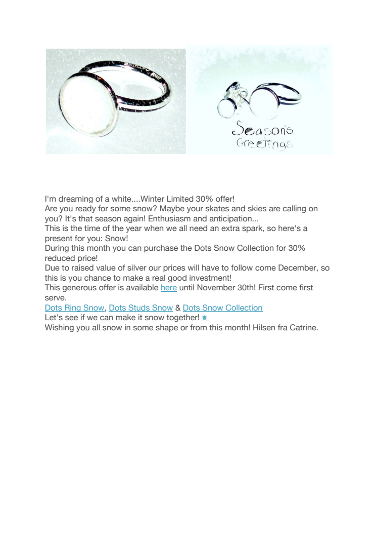 Are you ready for some snow? It's that season again! Enthusiasm and anticipation. Snow! During this month you can purchase the Dots Snow Collection for 30% reduced price! Dots Ring Snow, Dots Studs Snow & Dots Snow Collection Let's see if we can make it snow together! ❅ Wishing you all snow in some shape or from this month! Greetings from Catrine @ 925 Catrine Linder.