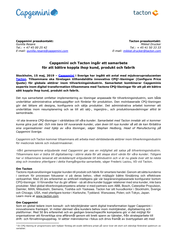 Capgemini i Sverige har ingått ett avtal med mjukvaruproducenten Tacton. Tillsammans ska företagen tillhandahålla innovativa CPQ -lösningar (Configure Price Quote) för globala aktörer inom tillverkningsindustrin.