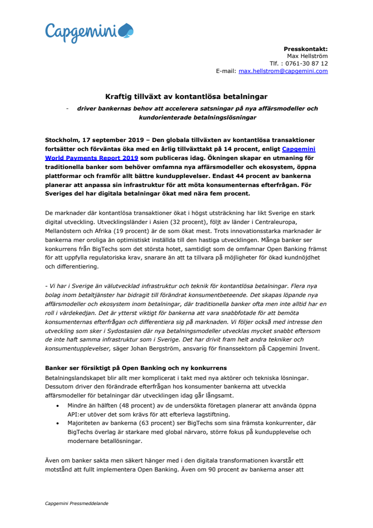 • Ny rapport: Kraftig tillväxt av kontantlösa betalningar driver bankernas behov att satsa på nya affärsmodeller