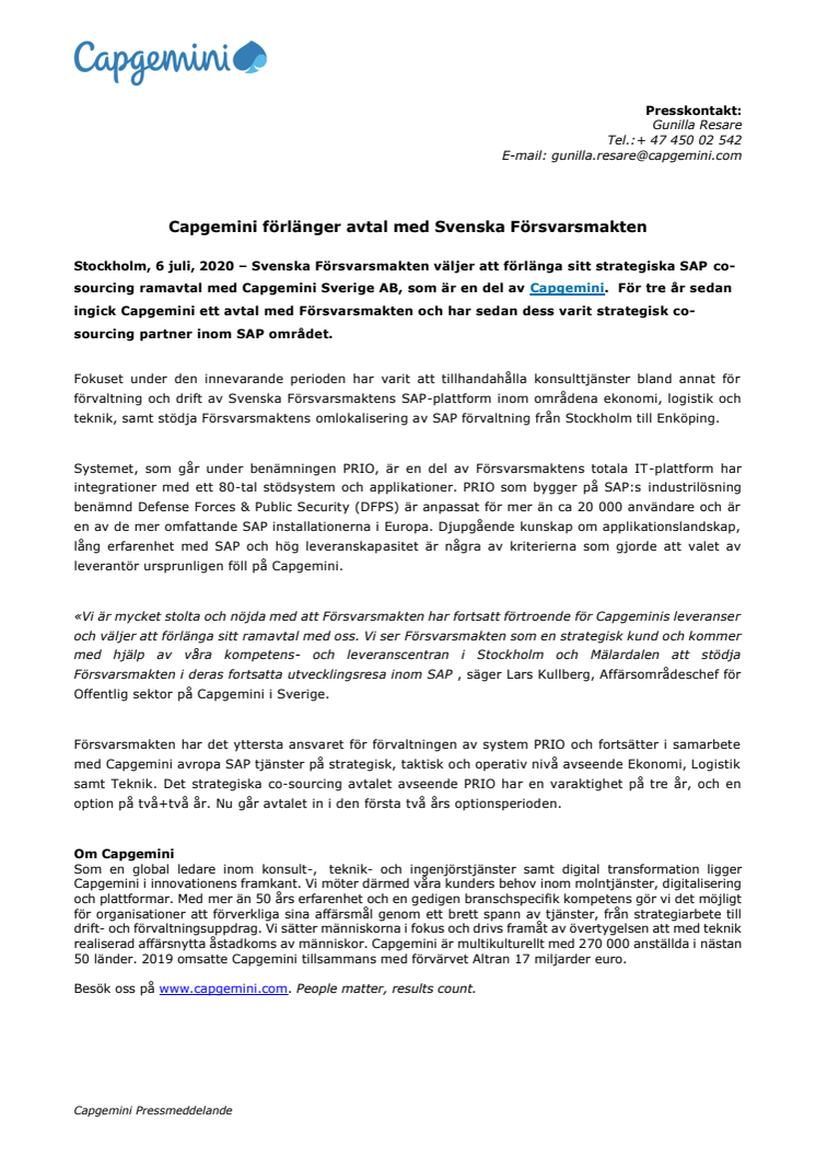 • Capgemini förlänger avtal med Svenska Försvarsmakten