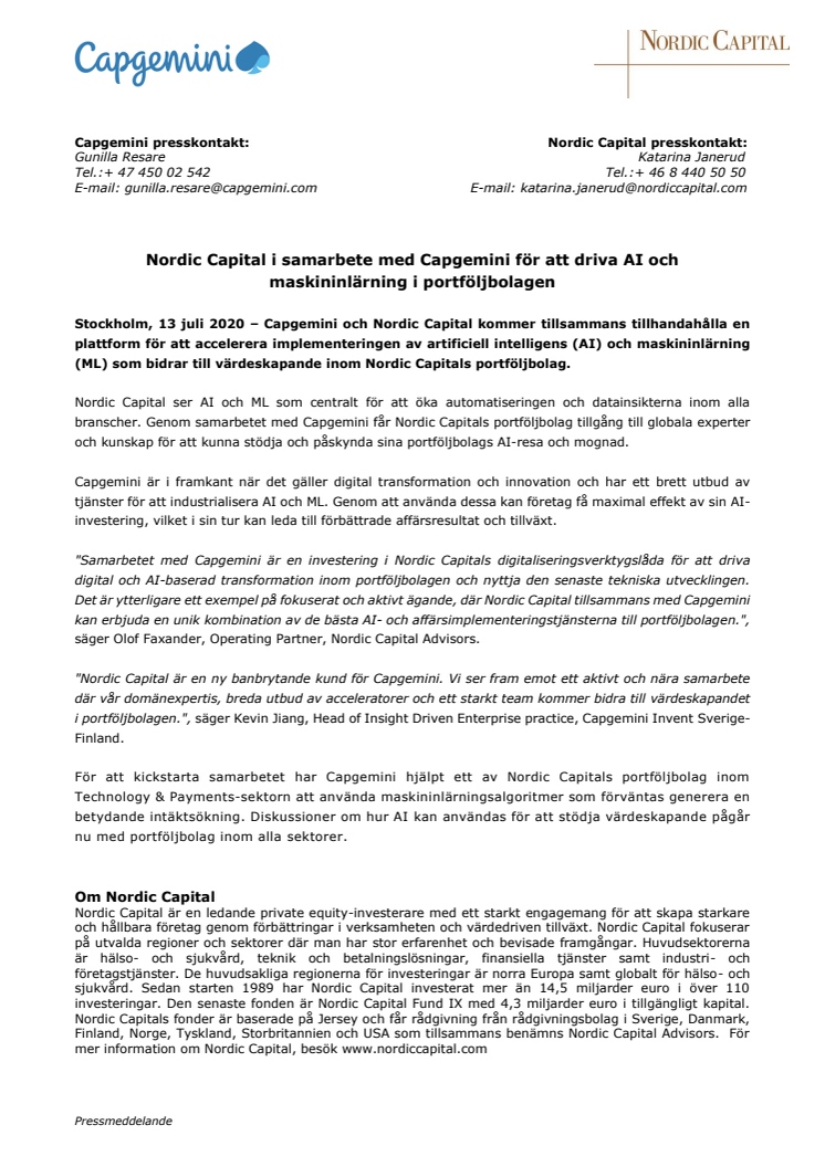 • Nordic Capital i samarbete med Capgemini för att driva AI och maskininlärning i portföljbolagen