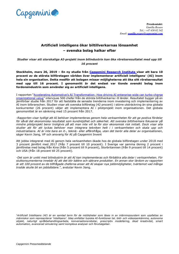 I rapporten “Accelerating Automotive’s AI Transformation: How driving AI enterprise-wide can turbo-charge organizational value” intervjuas 500 chefer från de största biltillverkarna i 8 länder. Resultatet bygger på en jämförbar studie från 2017 för att fastställa de senaste trenderna inom investering och implementering av AI inom bilbranschen. Studien visar att svenska bilföretag (42 procent) i större utsträckning än sina globala konkurrenter (26 procent) väljer att implementera AI i pilotprojekt inom organisationen. Det globala genomsnittet är en sänkning med 15 procent från 2017